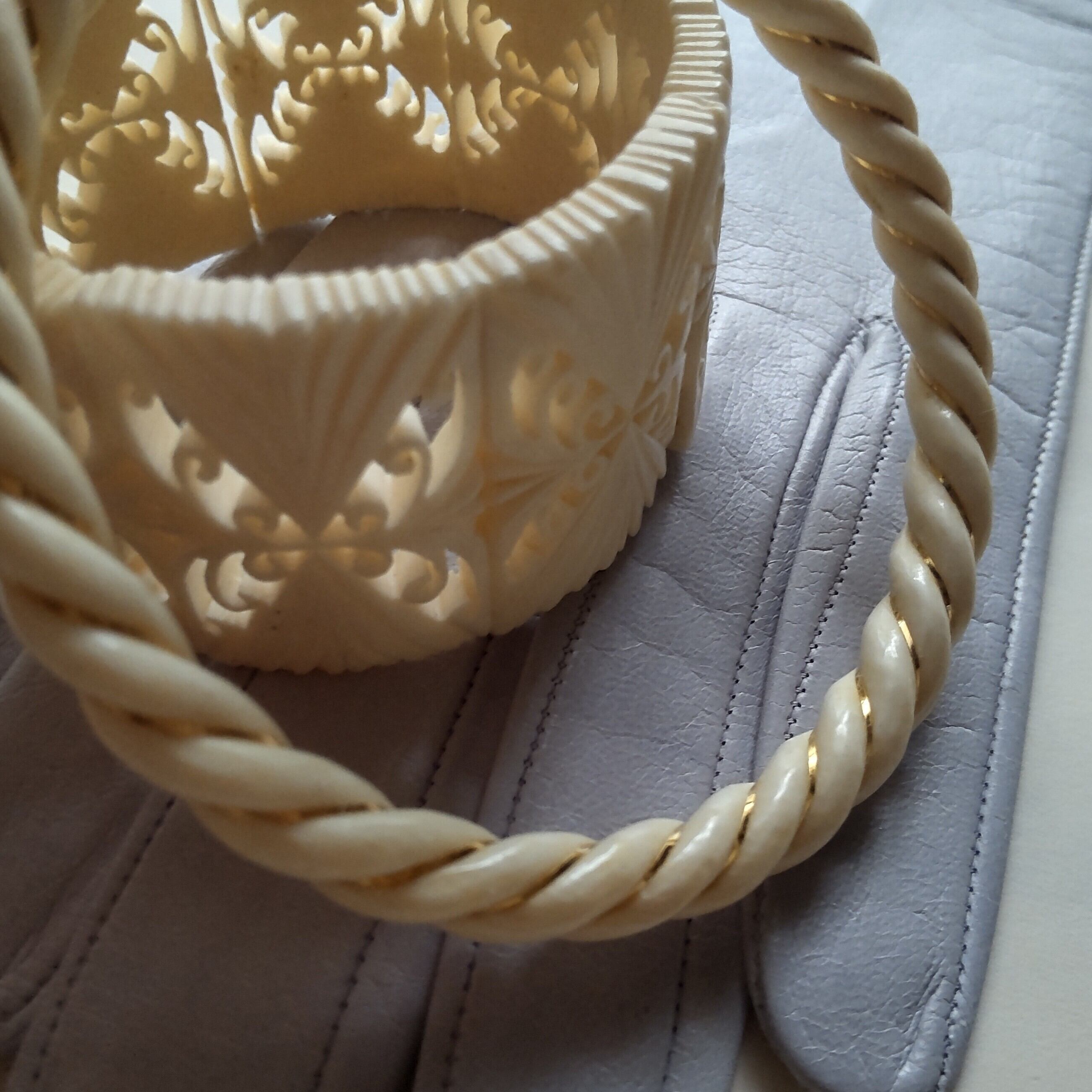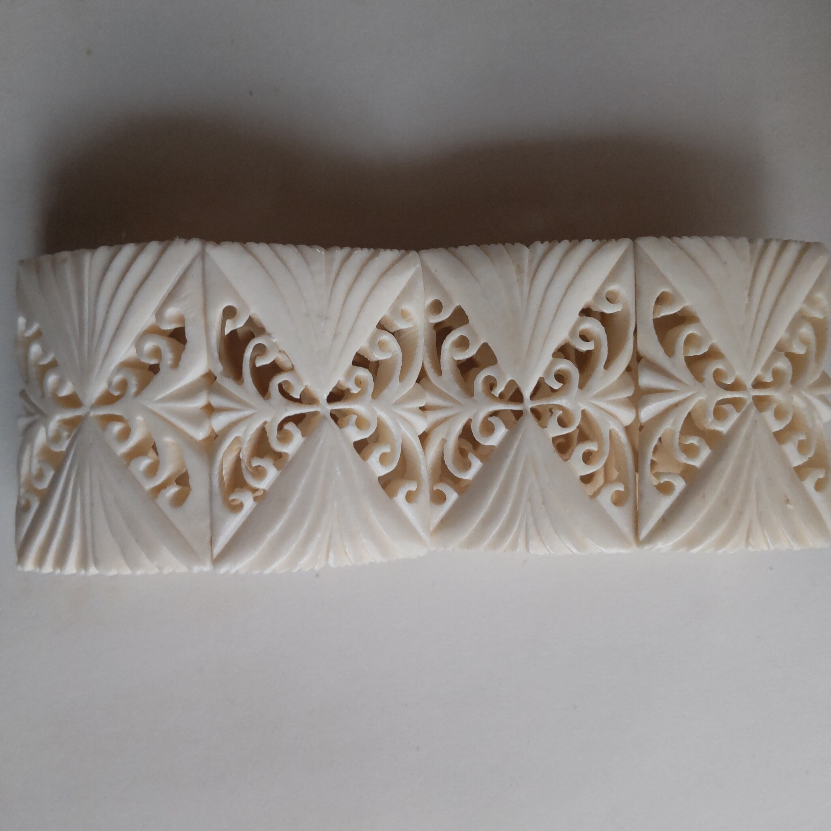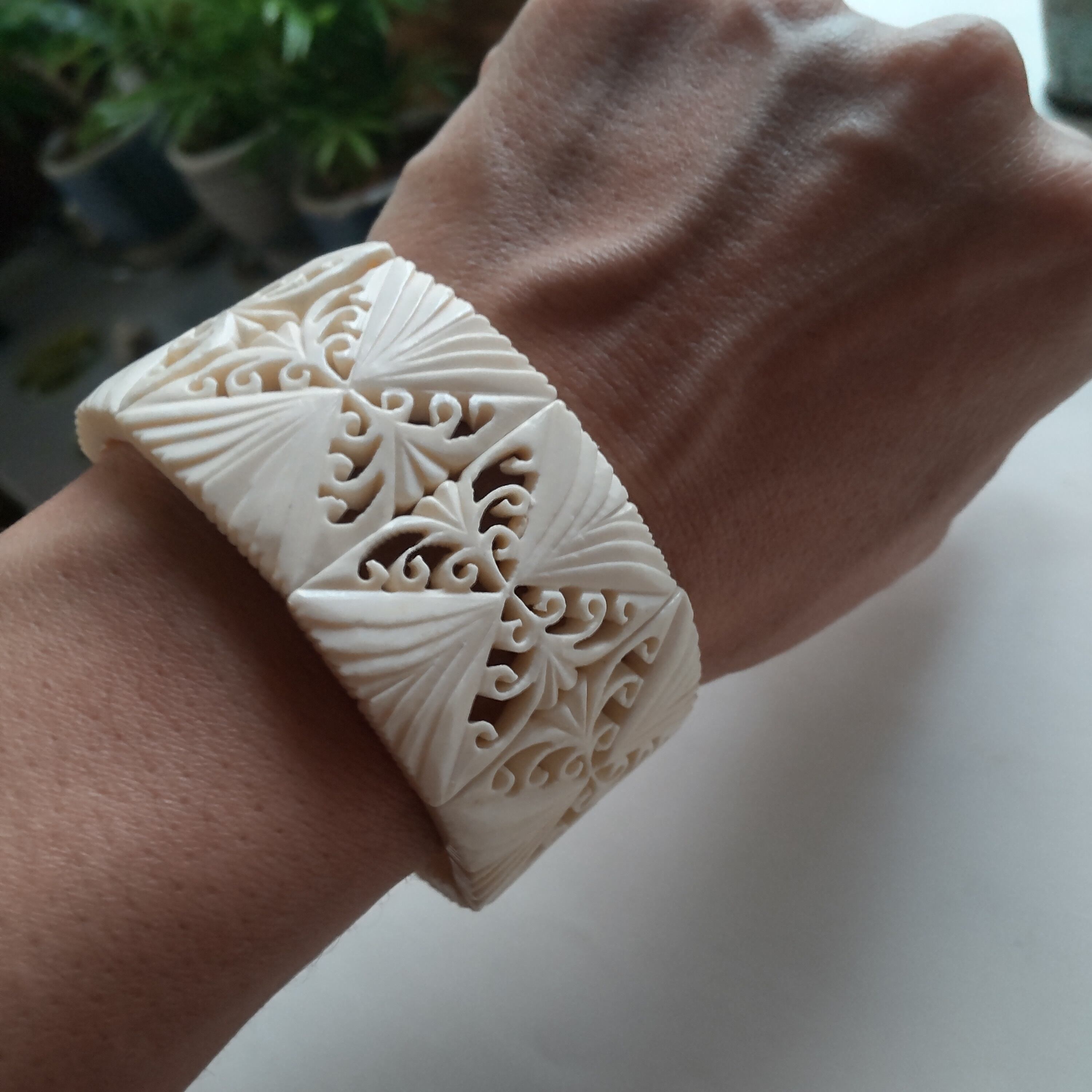 曲がりのある天然素材のパーツに透かし彫りをがデザインして繋げたヴィンテージバングルです