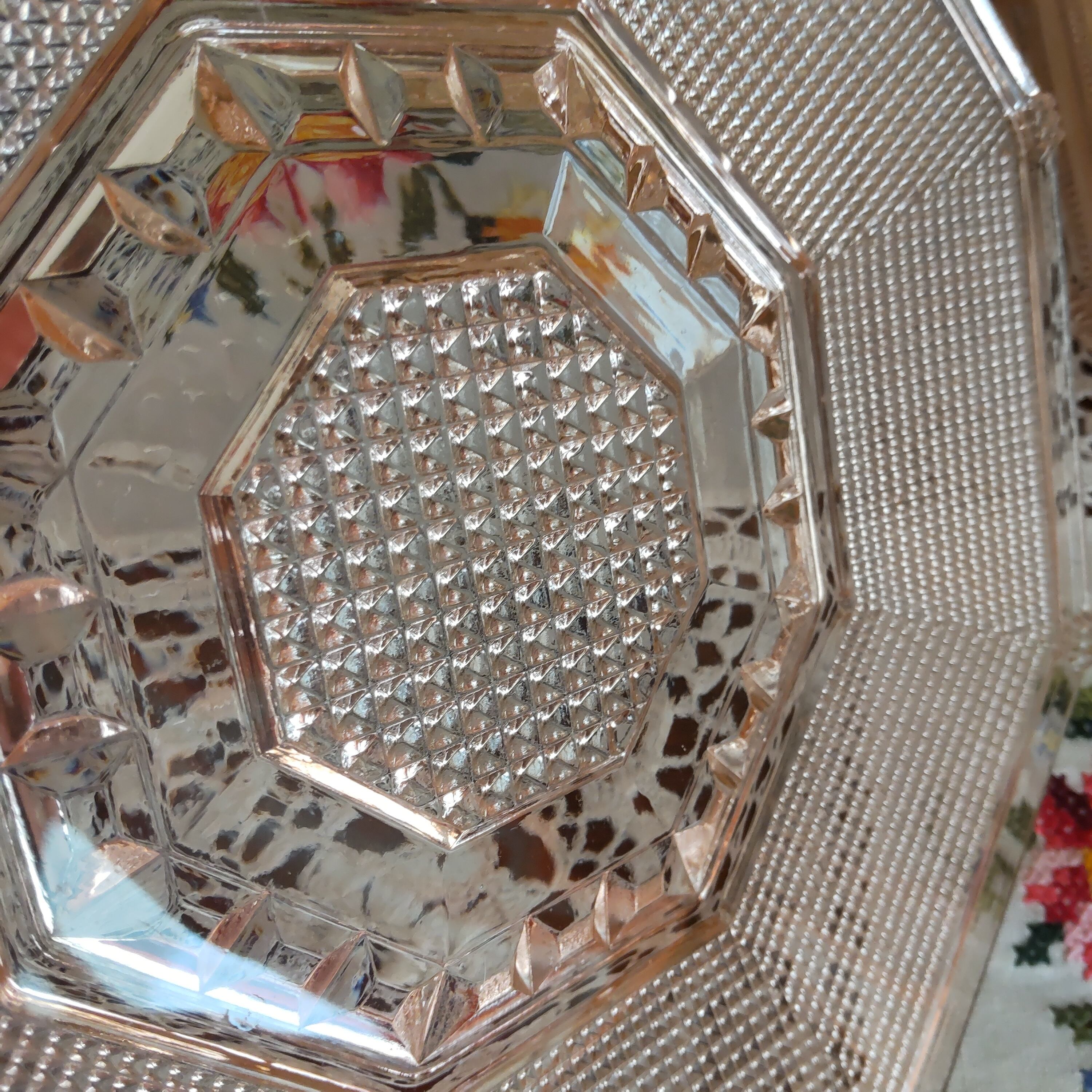 平たいガラス製の角皿でほんのりと淡いピンク色が上品です