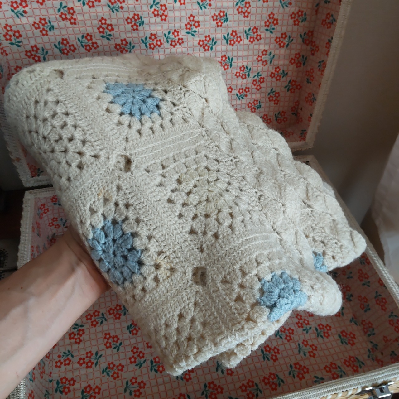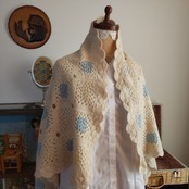 アイボリー、水色、クリーム色の淡い色合いの柔らかな雰囲気のヴィンテージストールです