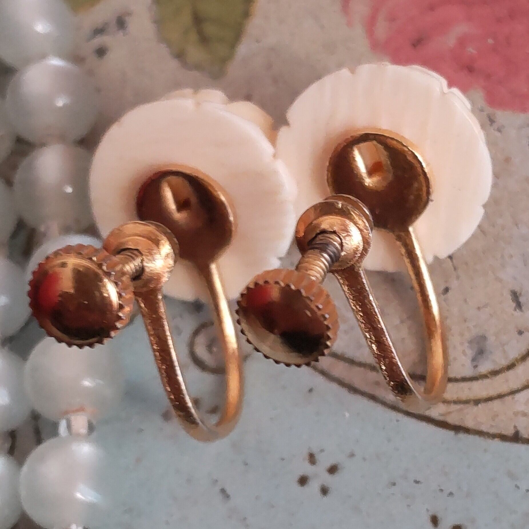 ころんとした小さな丸い薔薇の彫りがとても可愛らしい天然素材のヴィンテージイヤリングです